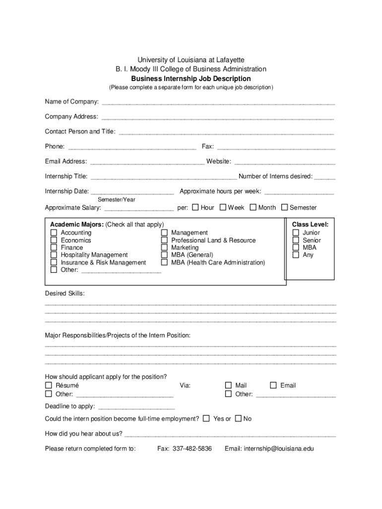 This form is designed for organizations to describe available business internship positions at the University of Louisiana at Lafayette. It captures details such as the company information, internship
