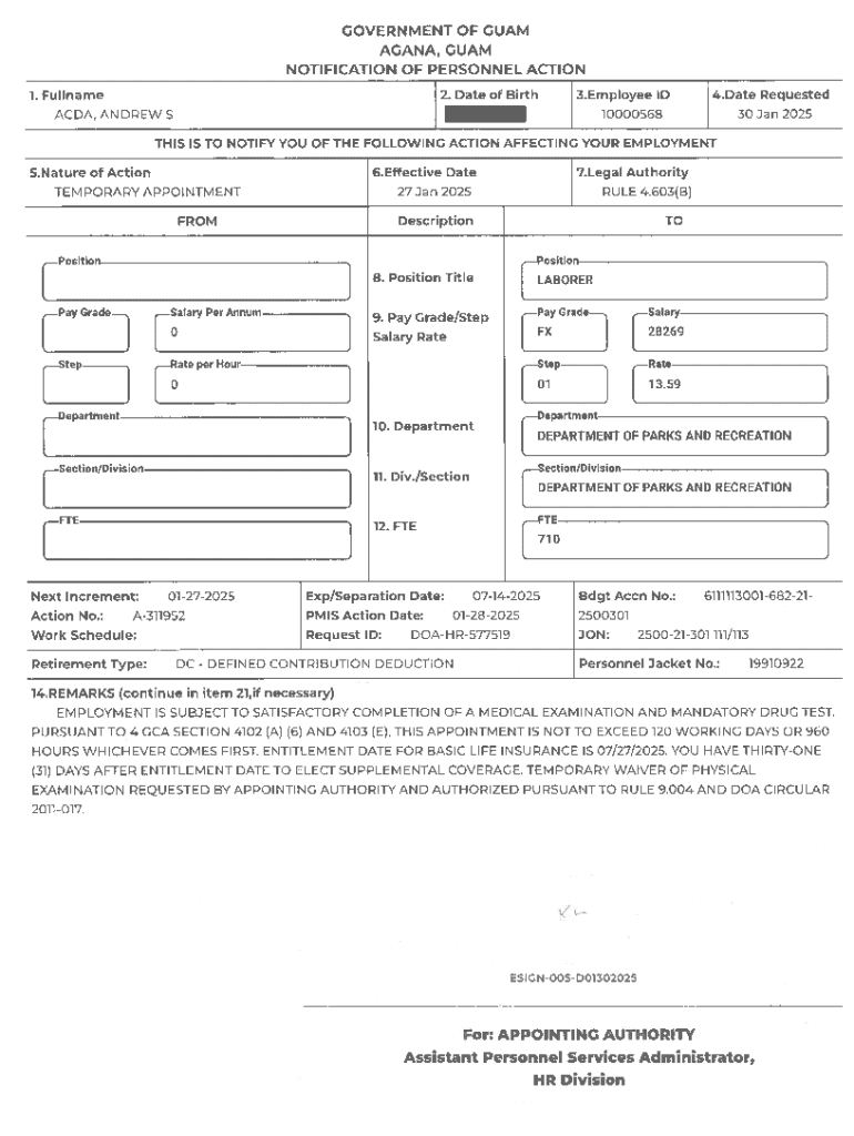 Este documento notifica las acciones de personal que afectan el empleo de los empleados del Gobierno de Guam, incluyendo detalles sobre nombramientos, promociones, incrementos salariales, terminaciones