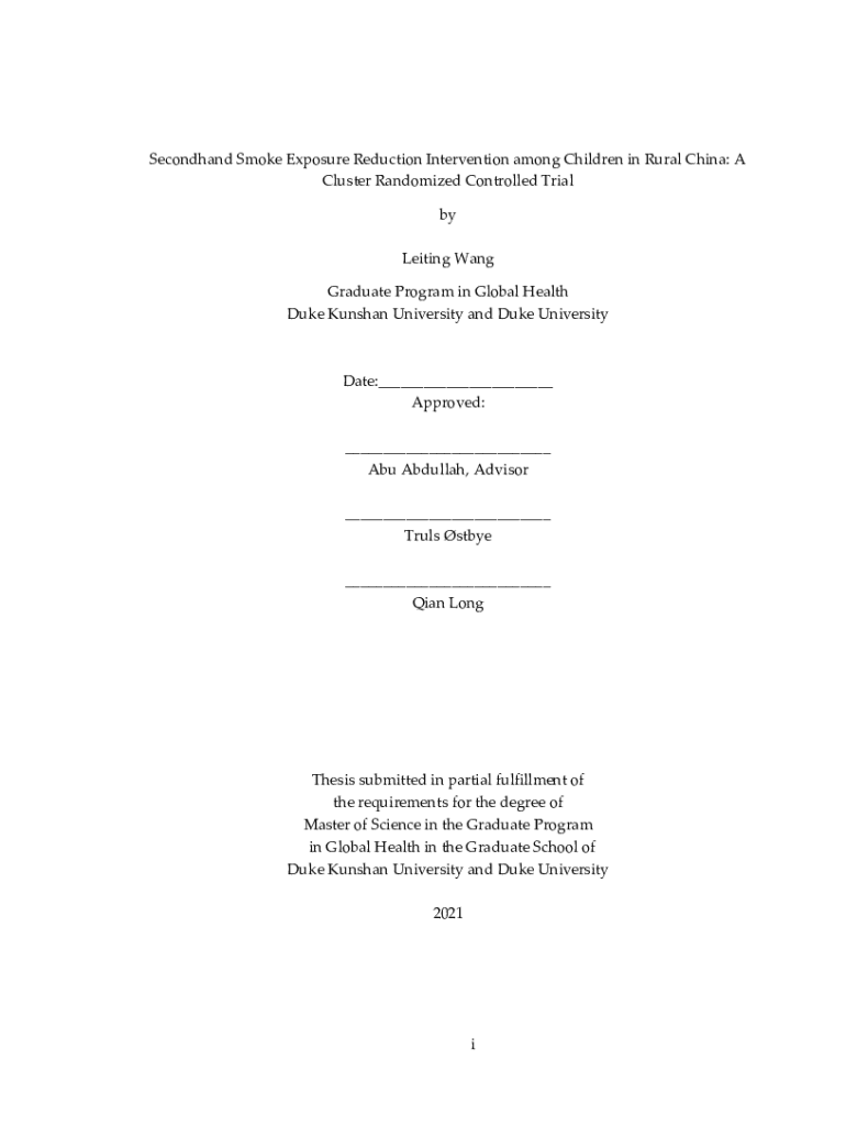 Secondhand Smoke Exposure Reduction Intervention among Children in Rural China: A Cluster Randomized Controlled Trial by Leiting Wang Graduate Program in Global Health Duke Kunshan University and
