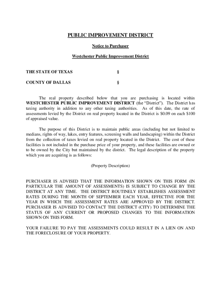 This document serves as a notice to purchasers of real property located within the Westchester Public Improvement District in Texas, informing them about the district\'s taxing authority, assessment