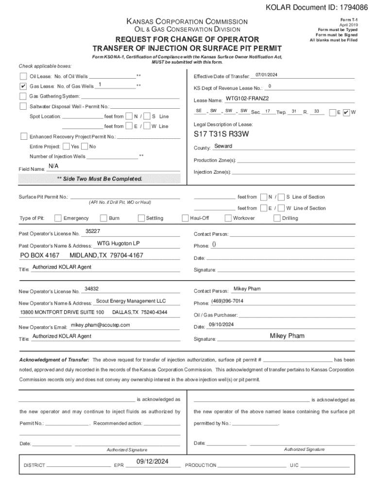 This form is a request for the transfer of an operator for an injection or surface pit permit in the oil and gas sector, to be filed with the Kansas Corporation Commission. It includes required certifications