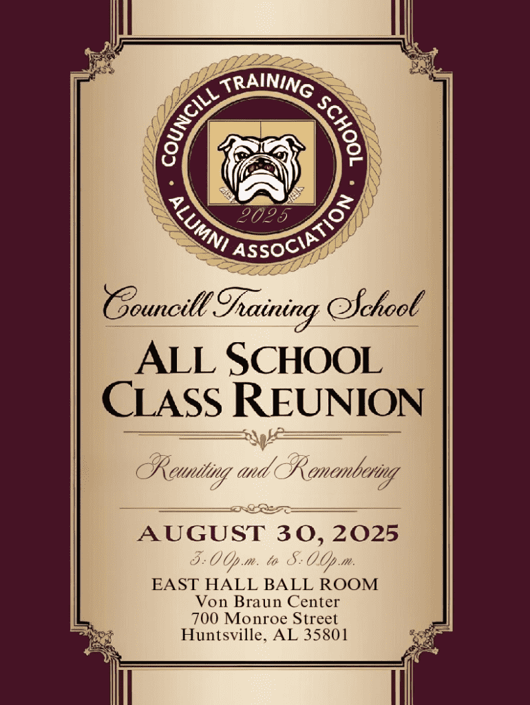 Join us for the 2025 Councill Training All-School Reunion on August 29-30, 2025, at Embassy Suites in Huntsville, Alabama. Relive cherished moments, rekindle friendships, and celebrate the legacy