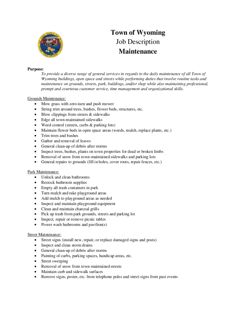 This document outlines the job responsibilities and duties related to maintenance services provided by the Town of Wyoming. It includes tasks related to grounds, park, street, building, and miscellaneous