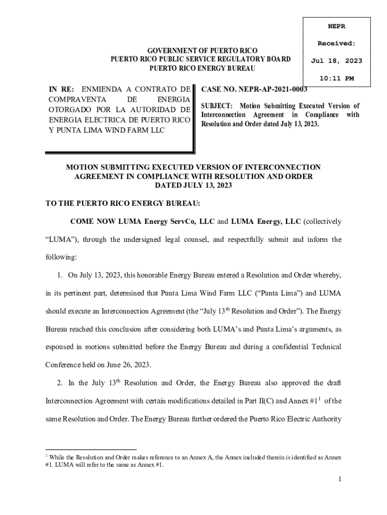 NEPRGOVERNMENT OF PUERTO RICO PUERTO RICO PUBLIC SERVICE REGULATORY BOARD PUERTO RICO ENERGY BUREAUReceived: Jul 18, 2023 10:11 PMIN RE: ENMIENDA A CONTRATO DE COMPRAVENTA DE ENERGIA OTORGADO POR