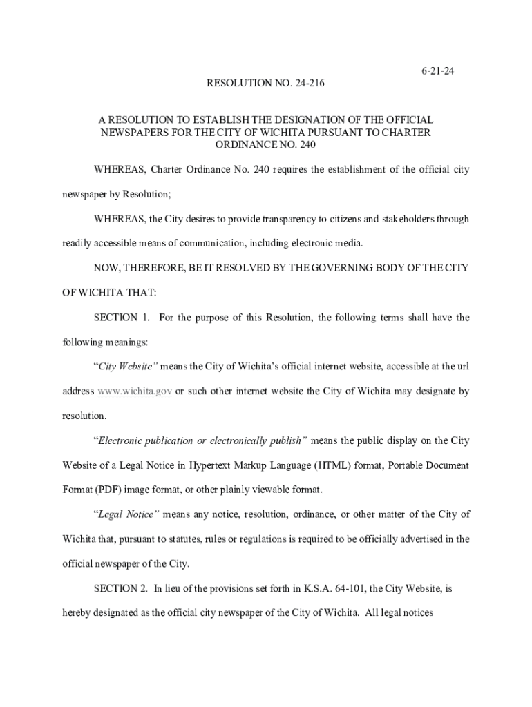 This resolution establishes the designation of the official city newspaper for Wichita, in compliance with Charter Ordinance No. 240, ensuring transparency and accessible communication for legal notices