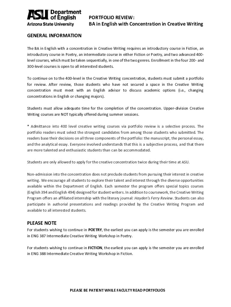 This document outlines the requirements and procedures for the Portfolio Review process for the BA in English with a concentration in Creative Writing at ASU. It details the necessary courses, portfolio