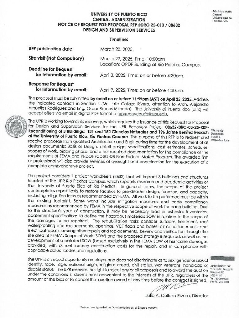 This document is a Request for Proposal (RFP) issued by the University of Puerto Rico to solicit proposals from qualified architecture and engineering firms for the assessment, design, and supervision