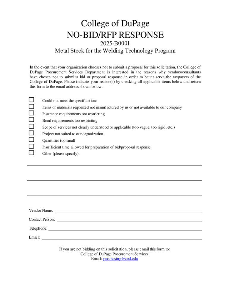 This document is an invitation for bids regarding the purchase of metal stock necessary for the Welding Technology Program at the College of DuPage for the fiscal year 2025.