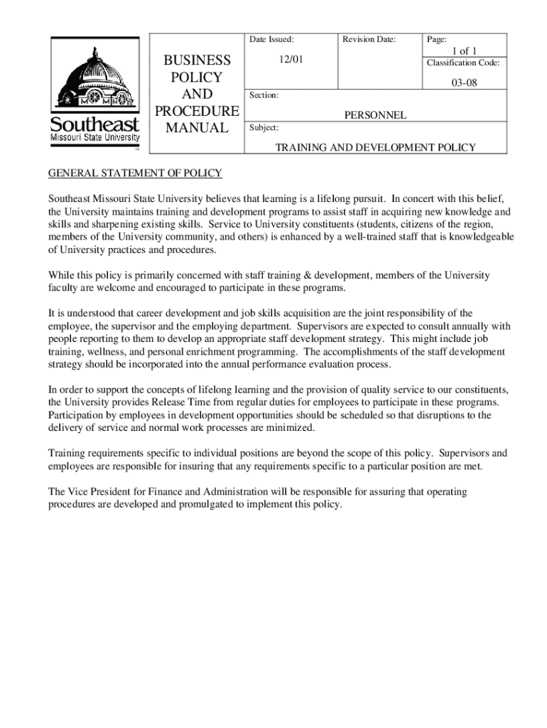 This document outlines the Training and Development Policy at Southeast Missouri State University, emphasizing the importance of lifelong learning and staff training programs. It describes the responsibilities