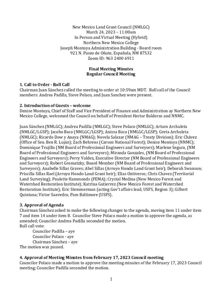 New Mexico Land Grant Council (NMLGC) March 24, 2023 11:00am In Person and Virtual Meeting (Hybrid) Northern New Mexico College Joseph Montoya Administration Building Board room 921 N. Paseo de Oate,