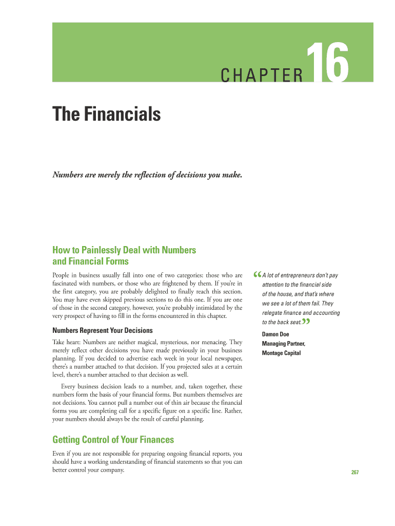 CHAPTER 16 The Financials Numbers are merely the reflection of decisions you make. How to Painlessly Deal with Numbers and Financial Forms People in business usually fall into one of two categories: