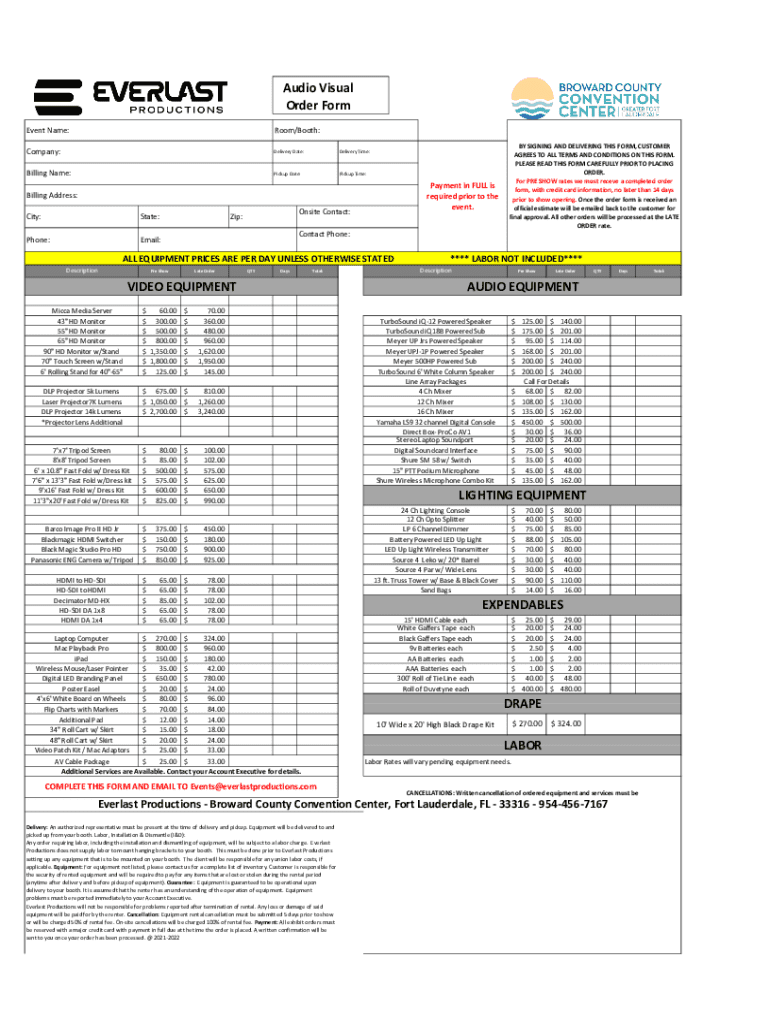 An audio visual order form is a document used to request audio and visual equipment or services for an event or production.