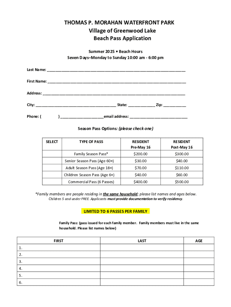 This form is used to apply for a beach pass at the Thomas P. Morahan Waterfront Park for the summer season of 2025. It includes options for different types of passes and requires personal information