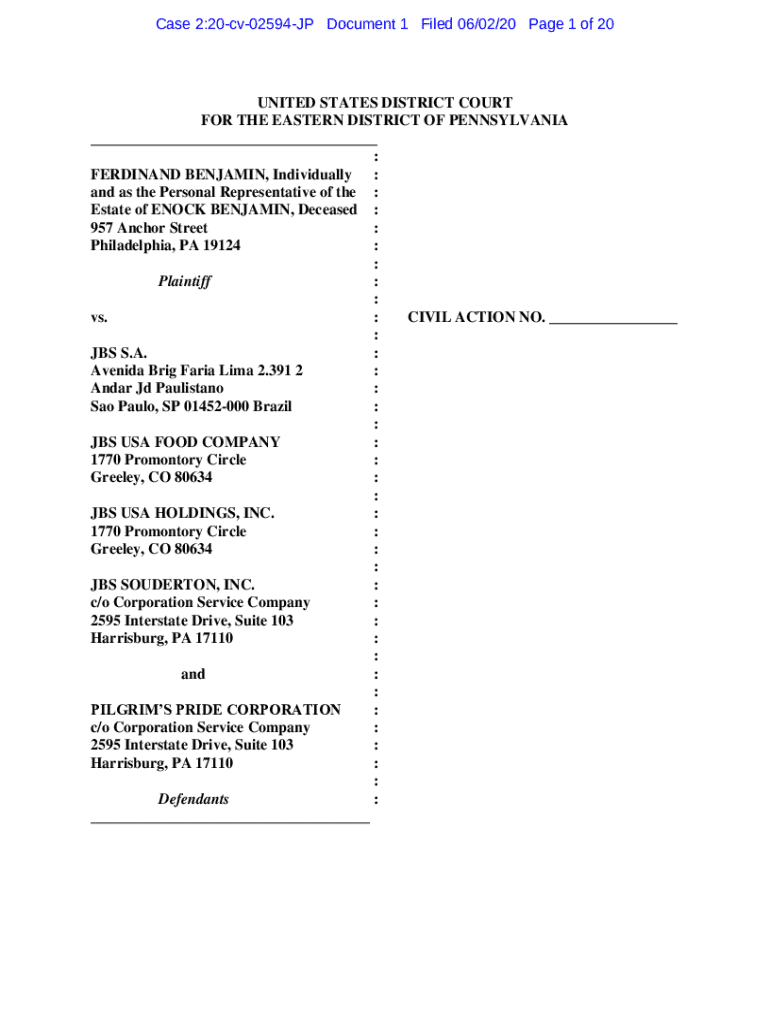 This document is a legal filing by JBS USA Food Company to formally remove a wrongful death and survival action from the Philadelphia County Court of Common Pleas to the United States District Court
