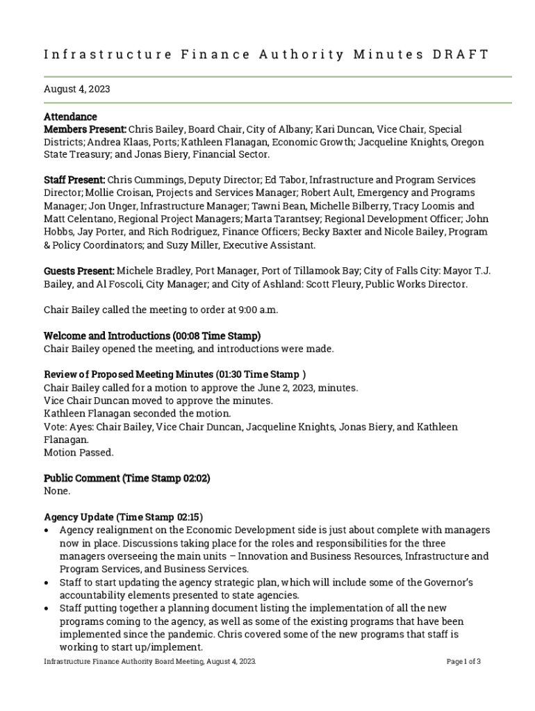 DRAFT minutes from the Infrastructure Finance Authority Board meeting held on August 4, 2023, detailing attendance, meeting proceedings, agency updates, project funding approvals for Falls City and