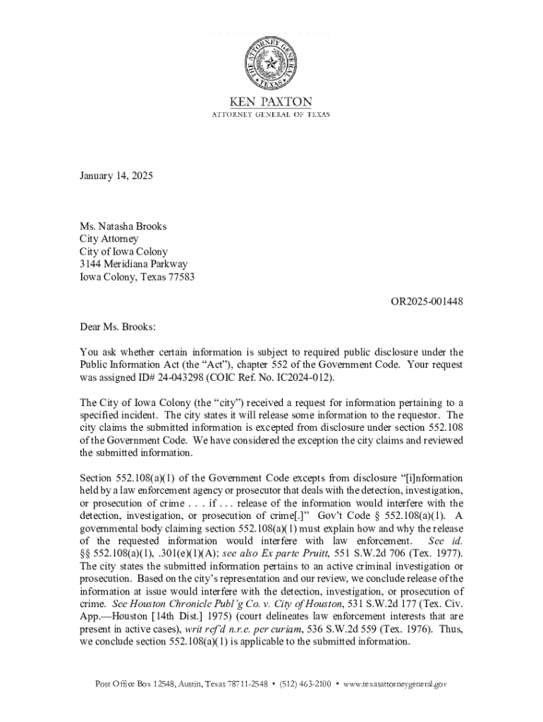 January 14, 2025Ms. Natasha Brooks City Attorney City of Iowa Colony 3144 Meridiana Parkway Iowa Colony, Texas 77583 OR2025001448 Dear Ms. Brooks: You ask whether certain information is subject to