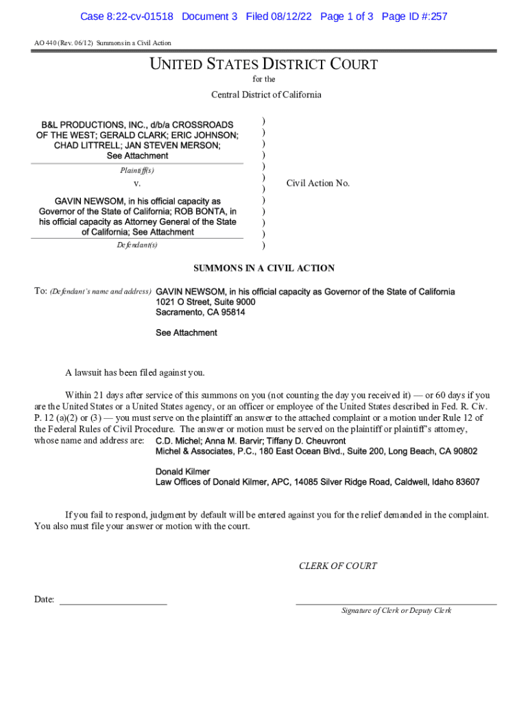 This document serves as a legal summons notifying the defendant of a lawsuit filed against them in the United States District Court for the Central District of California. It outlines the requirement