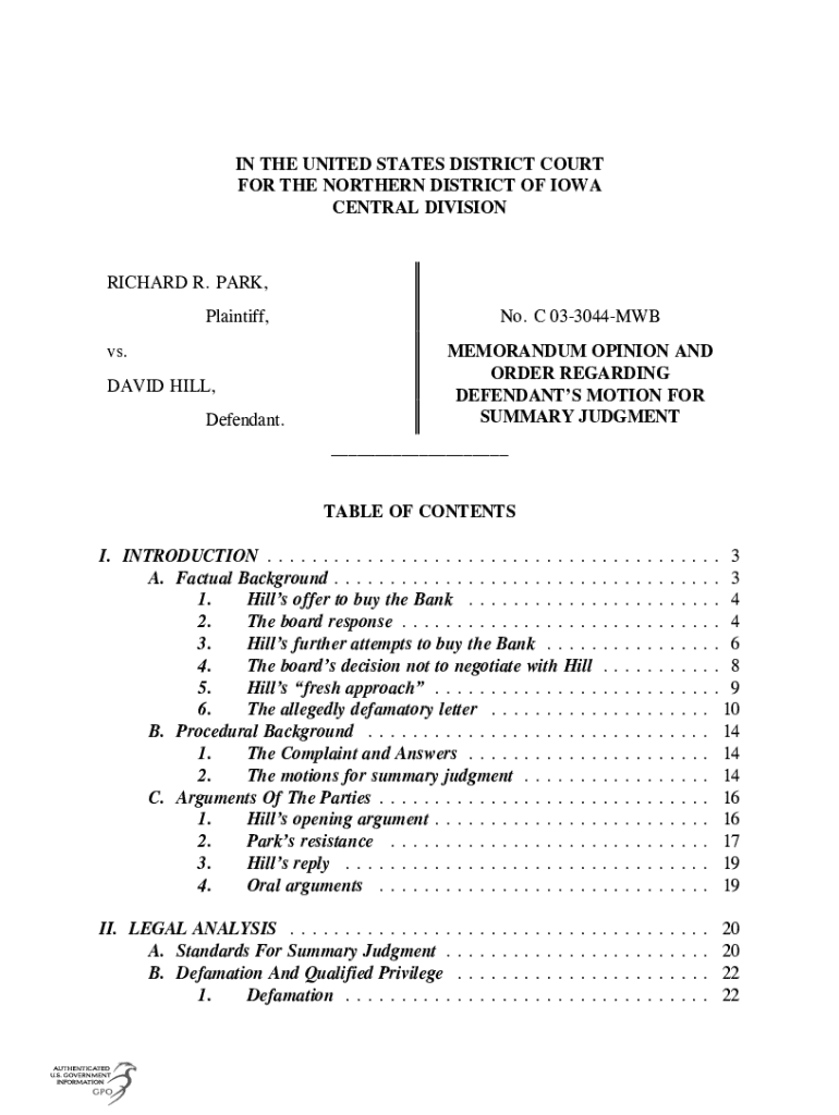 IN THE UNITED STATES DISTRICT COURT FOR THE NORTHERN DISTRICT OF IOWA CENTRAL DIVISIONRICHARD R. PARK, Plaintiff, vs. DAVID HILL, Defendant.No. C 033044MWB MEMORANDUM OPINION AND ORDER REGARDING DEFENDANTS