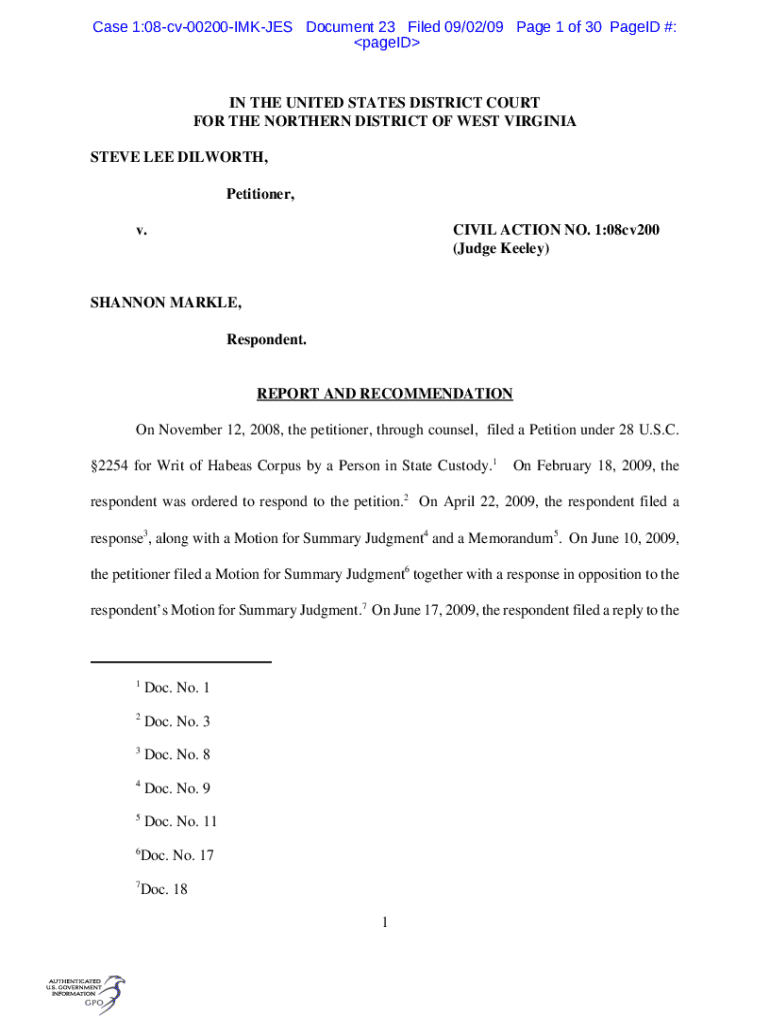 This document details the report and recommendation on a habeas corpus petition filed by Steve Lee Dilworth, addressing the legal proceedings regarding his conviction for sexual abuse. It includes