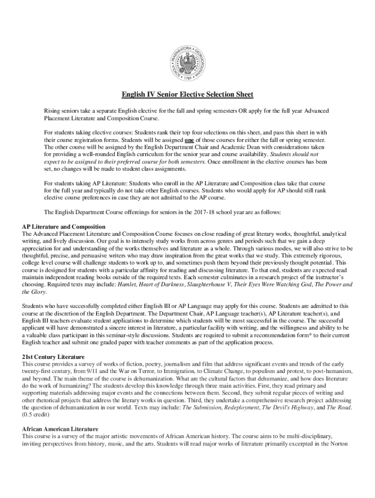 Get the free English Iv Senior Elective Selection Sheet