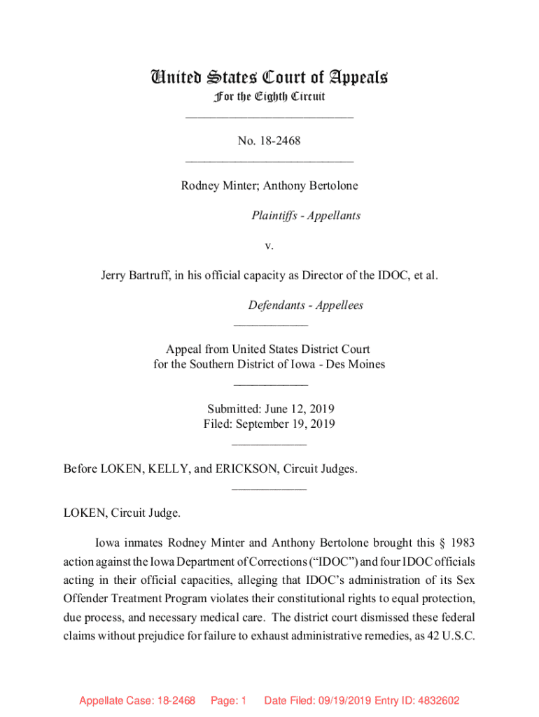 This document pertains to an appeal involving Iowa inmates Rodney Minter and Anthony Bertolone against the Iowa Department of Corrections regarding the alleged violations of their constitutional rights