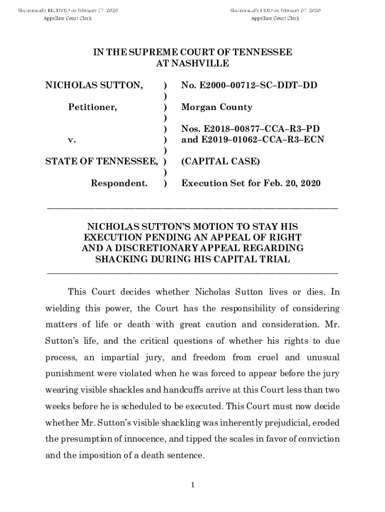 IN THE SUPREME COURT OF TENNESSEE AT NASHVILLE NICHOLAS SUTTON,) ) Petitioner, ) ) ) v. ) ) STATE OF TENNESSEE, ) ) Respondent. )No. E200000712SCDDTDD Morgan County Nos. E201800877CCAR3PD and E201901062CCAR3ECN
