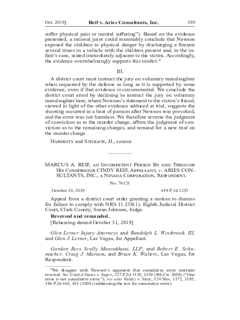 This document analyzes the case of Reif v. Aries Consultants, Inc., specifically focusing on the appeal concerning the failure to comply with NRS 11.258(1) regarding the required filing of an affidavit