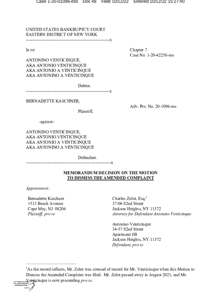 Case 12001096essDoc 48Filed 10/12/22Entered 10/12/22 15:27:40UNITED STATES BANKRUPTCY COURT EASTERN DISTRICT OF NEW YORK x In re:Chapter 7 Case No. 12042258essANTONINO VENTICINQUE, AKA ANTONIO VENTICINQUE