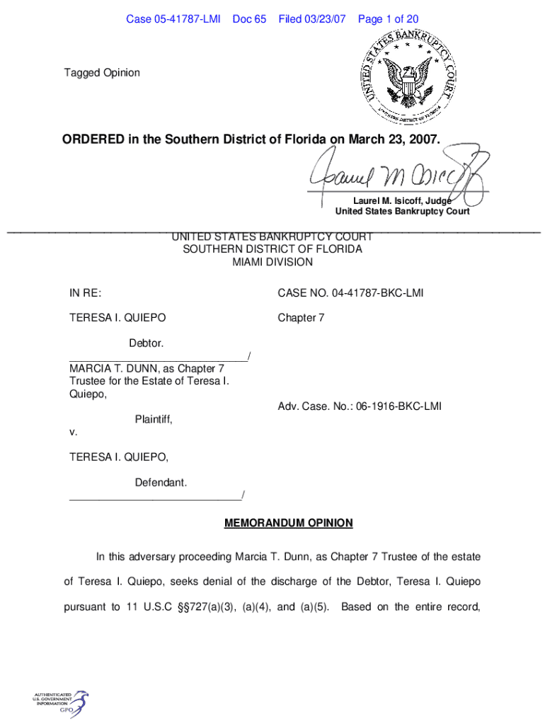 This document is a memorandum opinion from the United States Bankruptcy Court related to the case of Teresa I. Quiepo, in which the court denies the discharge based on allegations of false oaths and