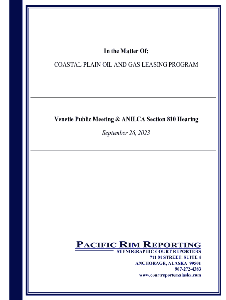 This document contains the transcript from the public meeting and ANILCA Section 810 hearing regarding the Coastal Plain Oil and Gas Leasing Program, held in Venetie, Alaska on September 26, 2023.