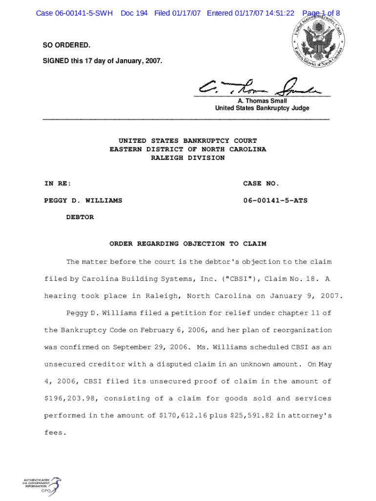 Case 06001415SWHDoc 194 Filed 01/17/07 Entered 01/17/07 14:51:22Page 1 of 8SO ORDERED. SIGNED this 17 day of January, 2007.___ A. Thomas Small United States Bankruptcy Judge___ UNITED STATES BANKRUPTCY