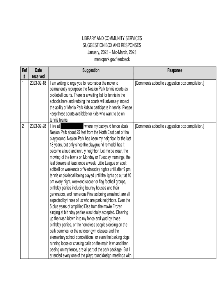 A collection of community feedback and responses regarding library services and community parks in Menlo Park from January 2023 to mid-March 2023.