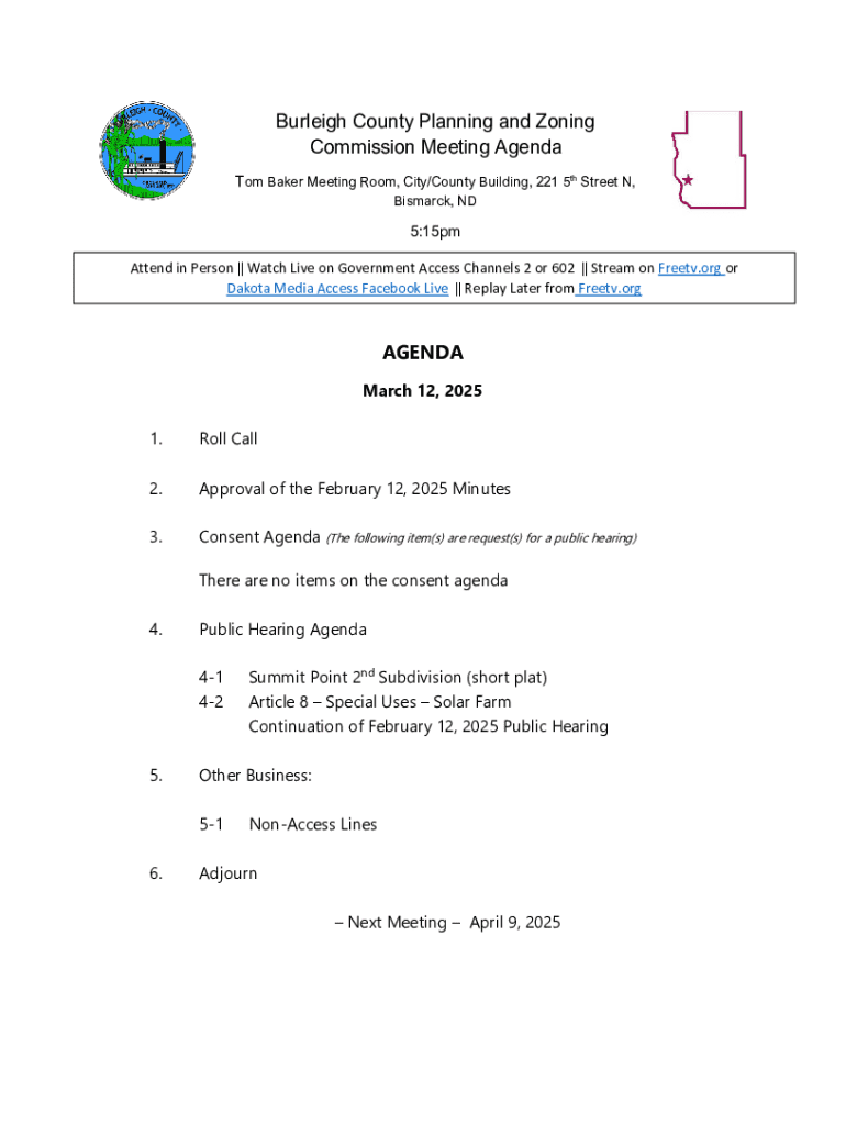 This document outlines the agenda for the Burleigh County Planning and Zoning Commission meeting held on March 12, 2025. It includes the roll call, approval of previous minutes, details of public