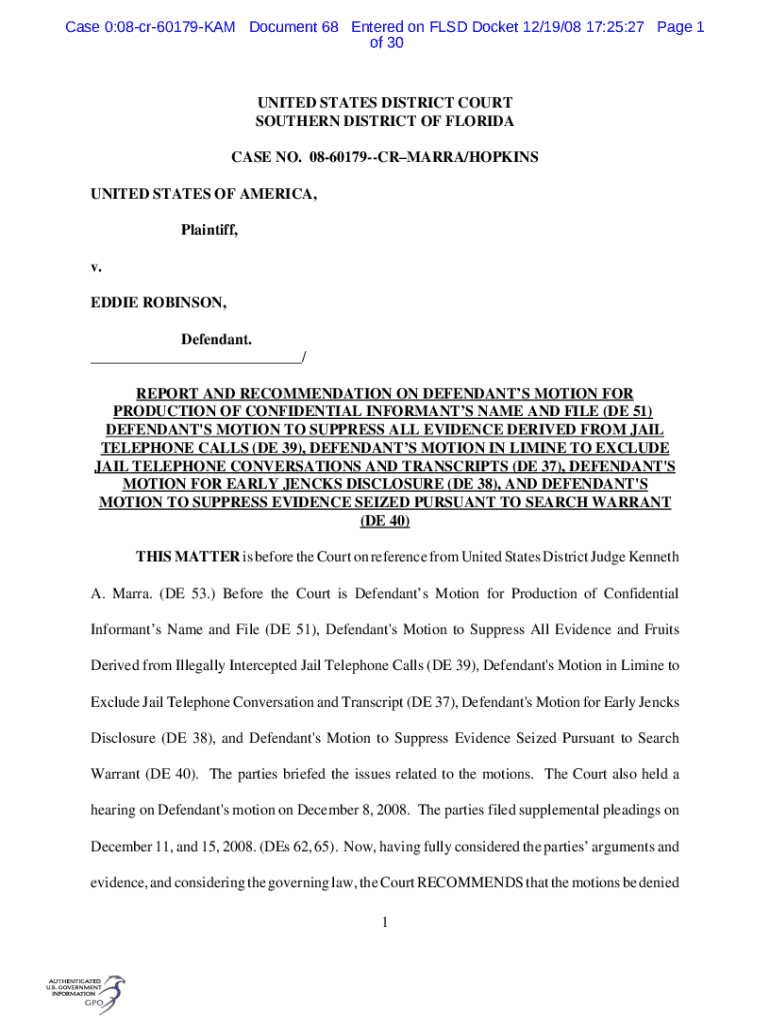 Get the free Case 0:08-cr-60179-KAM Document 68 Entered on FLSD Docket 12/19/08 17:25:27 Page 1