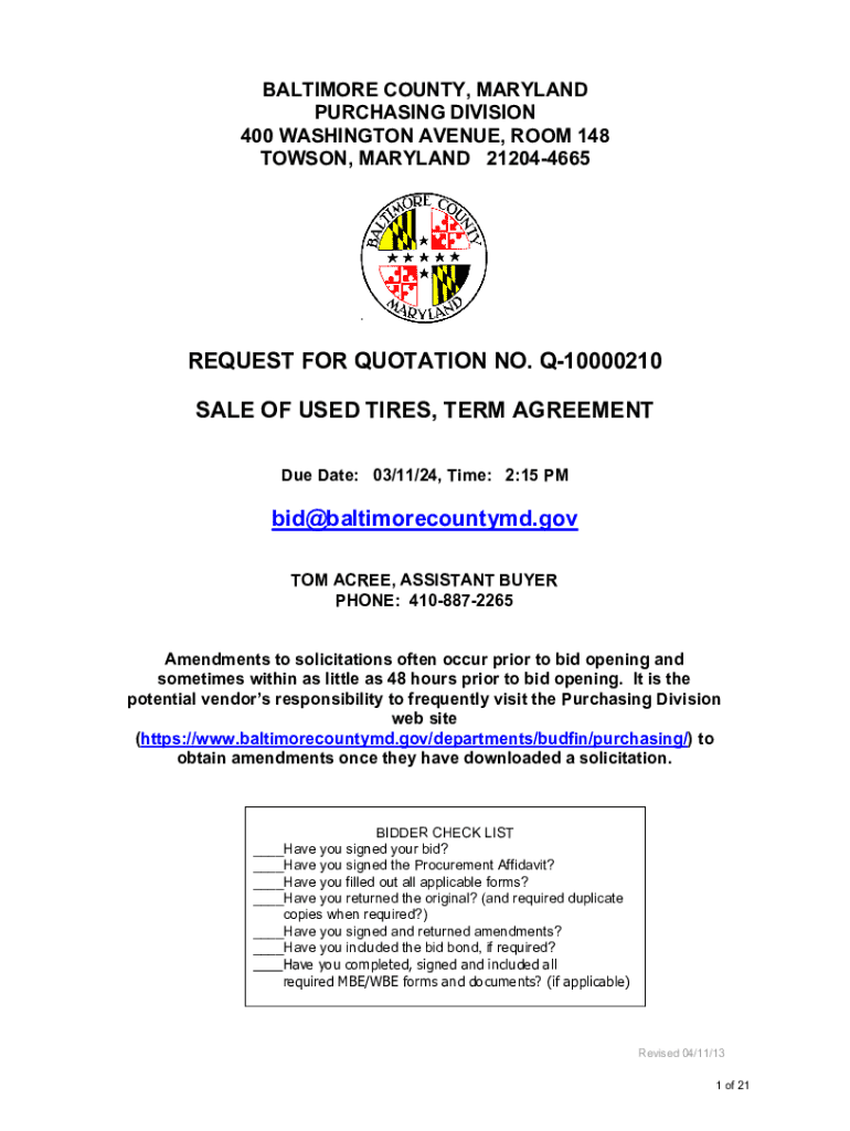 This document outlines the request for quotation from Baltimore County, Maryland for the sale of used tires. It details the necessary steps, bidder qualifications, and other conditions regarding the
