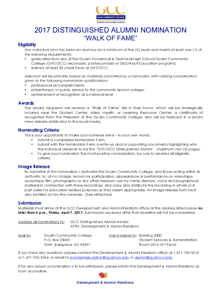 Nomination form for the \'Walk of Fame\' award honoring distinguished alumni of the Guam Community College, recognizing their professional accomplishments, community service, and achievements.
