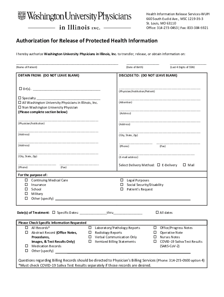 Health Information Release ServicesWUPI 660 South Euclid Ave., MSC 1219353 St. Louis, MO 63110 Office: 3142730453| Fax: 8333845921Authorization for Release of Protected Health Information I hereby