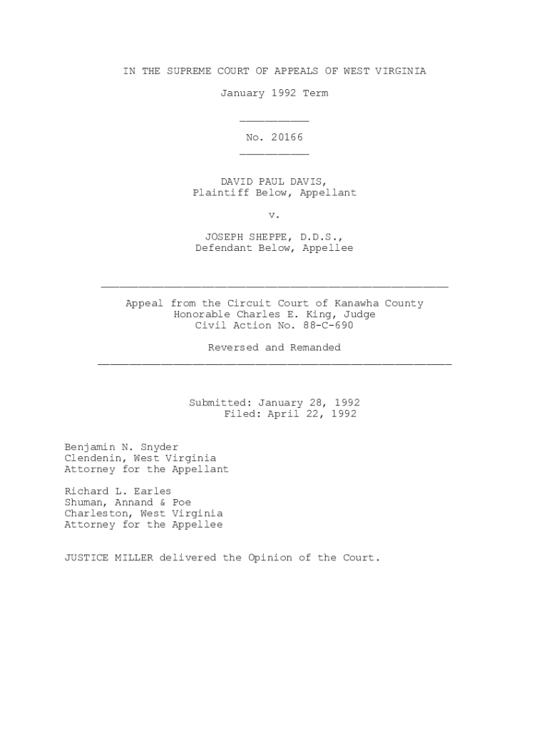 IN THE SUPREME COURT OF APPEALS OF WEST VIRGINIA January 1992 Term ___ No. 20166 ___ DAVID PAUL DAVIS, Plaintiff Below, Appellant v. JOSEPH SHEPPE, D.D.S., Defendant Below, Appellee ___ Appeal from