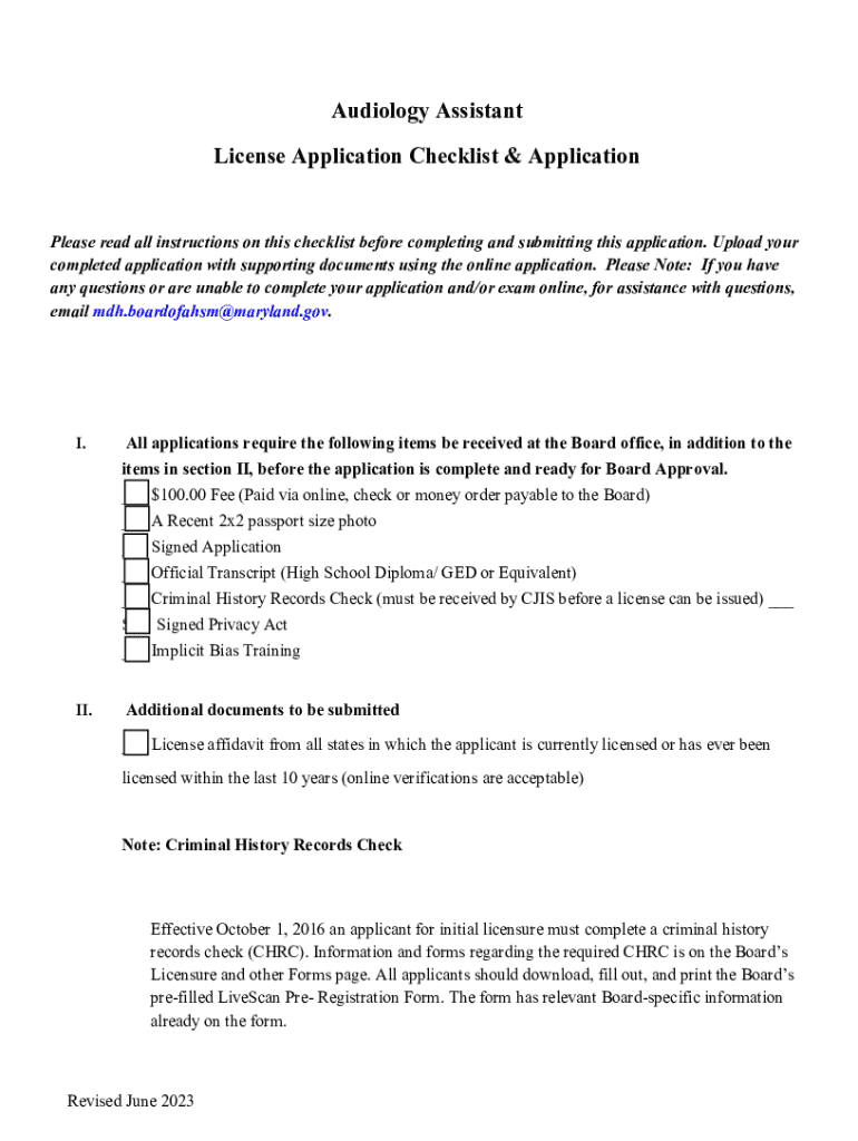 This document outlines the necessary checklist and procedures for applying for an Audiology Assistant license in Maryland. Applicants must provide various documents, including a fee, passport-sized