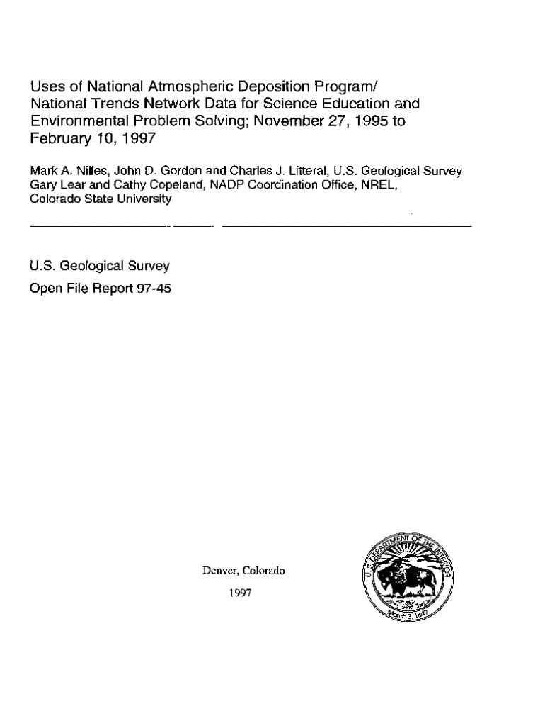 Uses of National Atmospheric Deposition Program/ National Trends Network Data for Science Education and Environmental Problem Solving; November 27, 1995 to February 10, 1997 Mark A. Nilles, John D.