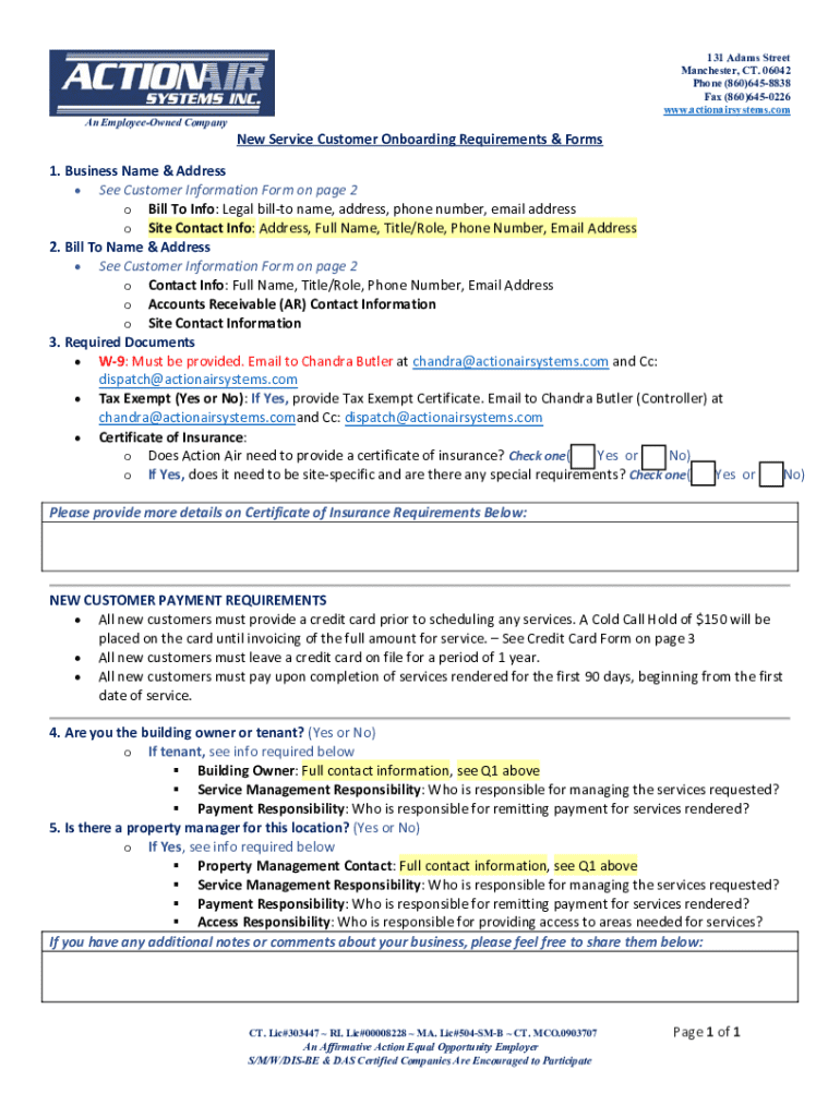 This document outlines the onboarding requirements and forms necessary for new service customers, including submission of business details, credit card information, and various required documents