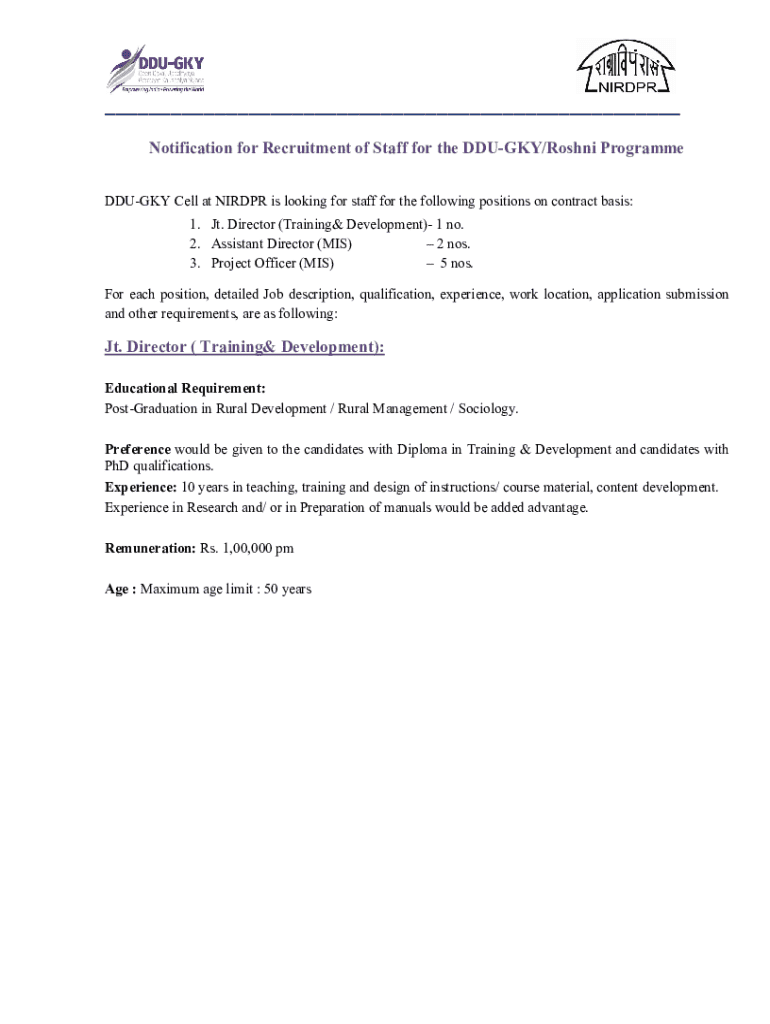 ___ Notification for Recruitment of Staff for the DDUGKY/Roshni Programme DDUGKY Cell at NIRDPR is looking for staff for the following positions on contract basis: 1. Jt. Director (Training& Development)