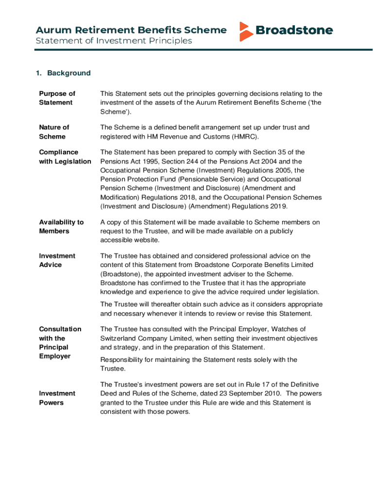 Get the free Aurum Retirement Benefits Scheme Statement of Investment Principles