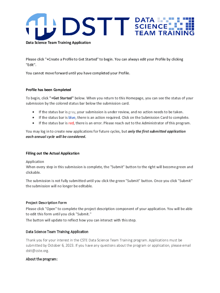 This application allows teams to apply for the CSTE Data Science Team Training program, which aims to enhance data science skills through online courses, coaching, and project-based learning. Teams