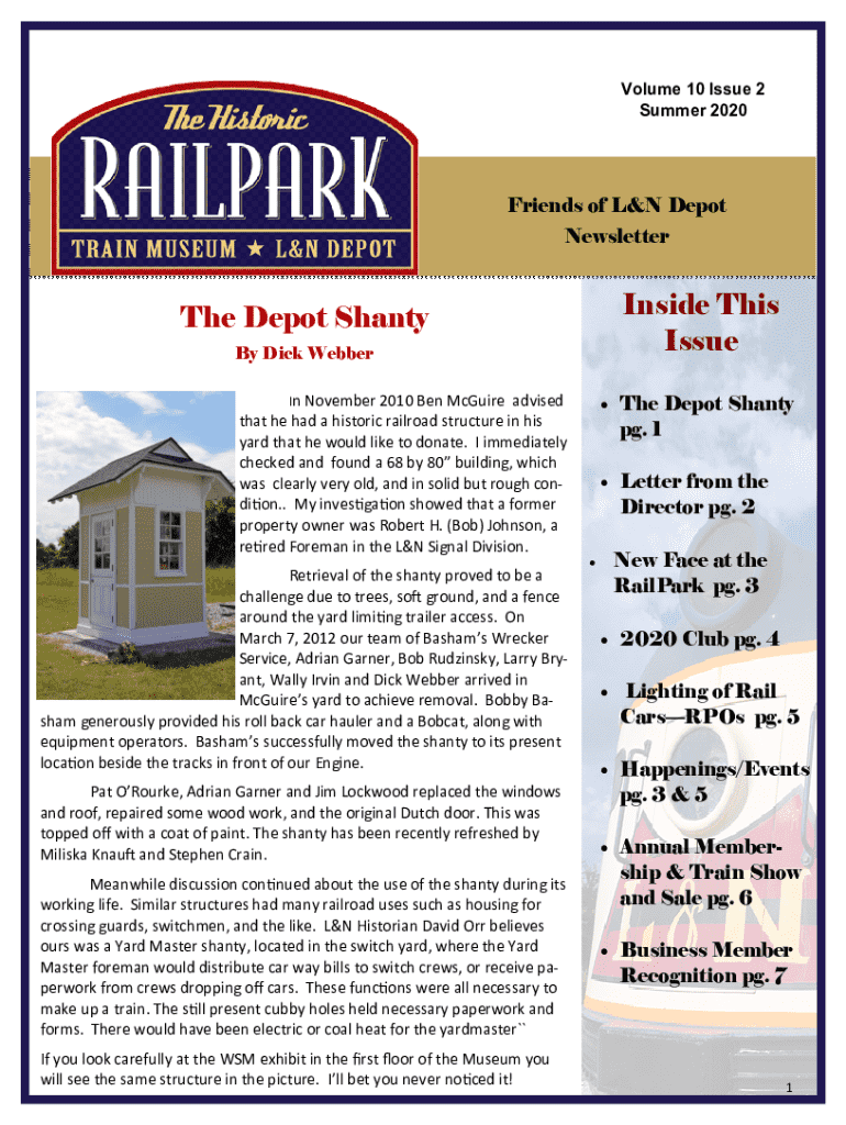 This newsletter provides updates on the activities, projects, and events at the L&N Depot, including the restoration of the Depot Shanty, annual membership details, upcoming events, and information