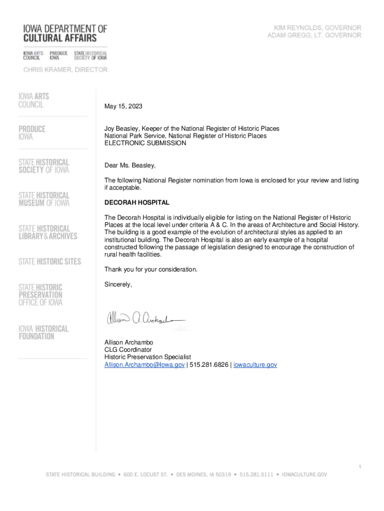 The Decorah Hospital is individually eligible for listing on the National Register of Historic Places at the local level under criteria A & C. It is a significant example of the evolution of architectural