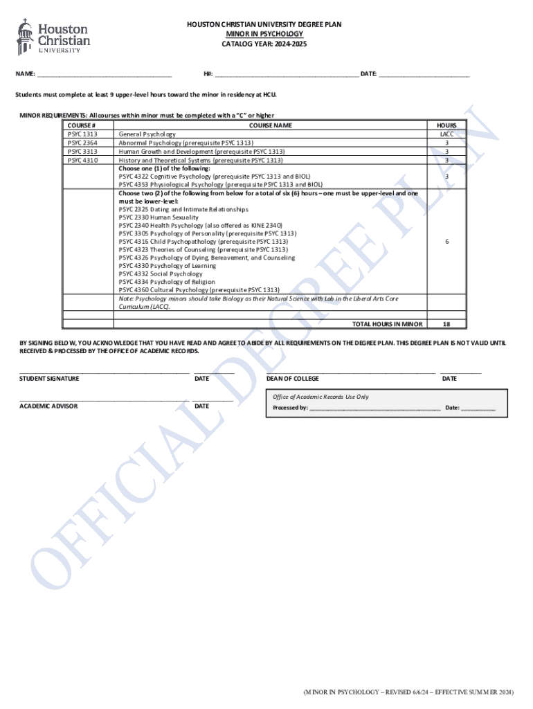 This document outlines the degree plan requirements for students pursuing a minor in Psychology at Houston Christian University for the catalog year 2024-2025. It includes essential course prerequisites,