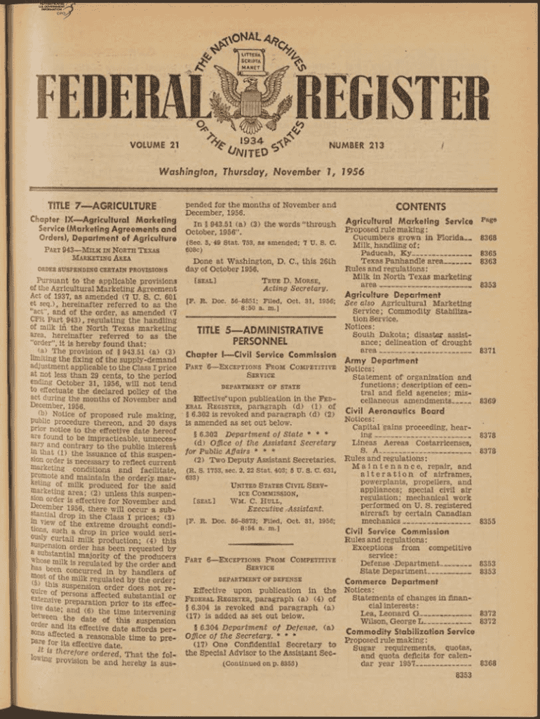 ^VOLUME 21^ ,o n a l. *i iiTtrn& *, *9 3 4vr^NUMBER 213^ A / IT E O ^Washington, Thursday, November 1, 1956TITLE 7 AGRICULTURE Chapter IX Agricultural Marketing Service (Marketing Agreements and Orders),