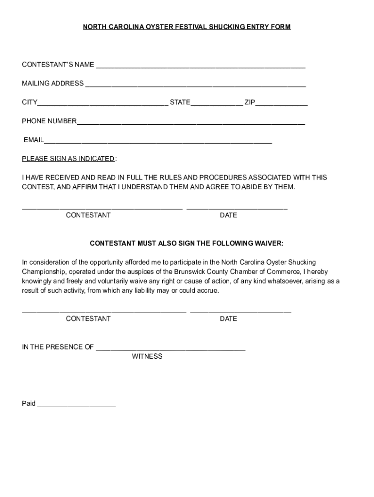 This is the entry form for contestants participating in the North Carolina Oyster Shucking Championship, including contestant information, agreement to rules, and a waiver of liability.