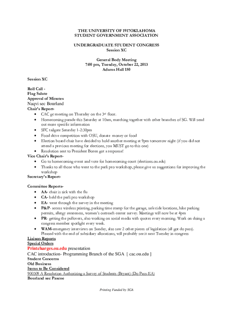 THE UNIVERSITY OF 1917OKLAHOMA STUDENT GOVERNMENT ASSOCIATION UNDERGRADUATE STUDENT CONGRESS Session XC General Body Meeting 7:00 pm, Tuesday, October 22, 2013 Adams Hall 150 Session XC Roll Call